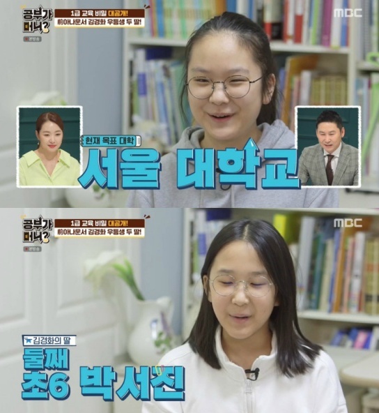 이어 김경화는 두 딸 박서연 양과 박서진 양의 인터뷰가 공개됐는데요, 박서연 양은 "방송인 김경화의 딸 중학교 3학년 박서연이다. 목표하는 서울대학교이고 법조인으로서 일하고 싶다"라며 밝혔습니다.