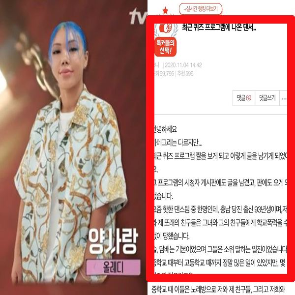 덕분에 지난해 9월 tvN '유 퀴즈 온더 블럭'에 출연하는 등 활발한 활동을 이어 갔으나, 방송 이후 한 온라인 커뮤니티에 '최근 퀴즈 프로그램에 나온 댄서'라는 제목의 글이 올라오면서 학폭 의혹이 제기되었습니다.