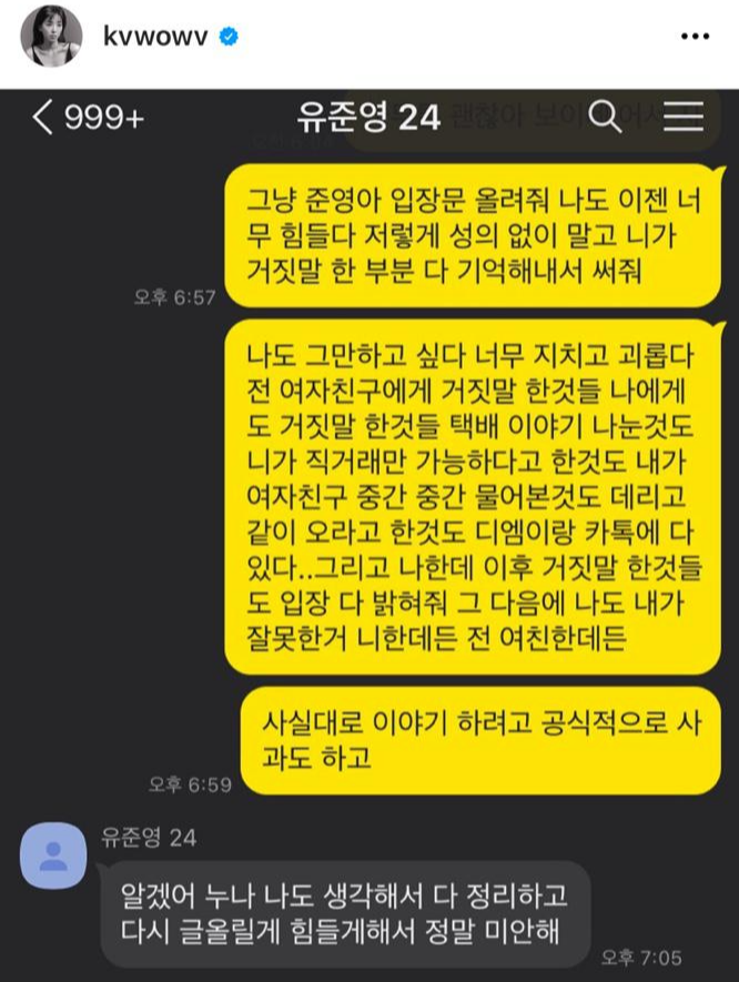유준영이 양다리 논란에 휩싸이자 "헤어진지 얼마 안돼서 만나게 된 것은 눈살 찌푸려질 수 있는 걸 이해하지만 허위글로 인해 상처 받고 싶지 않다"라며 두둔한 바 있습니다.