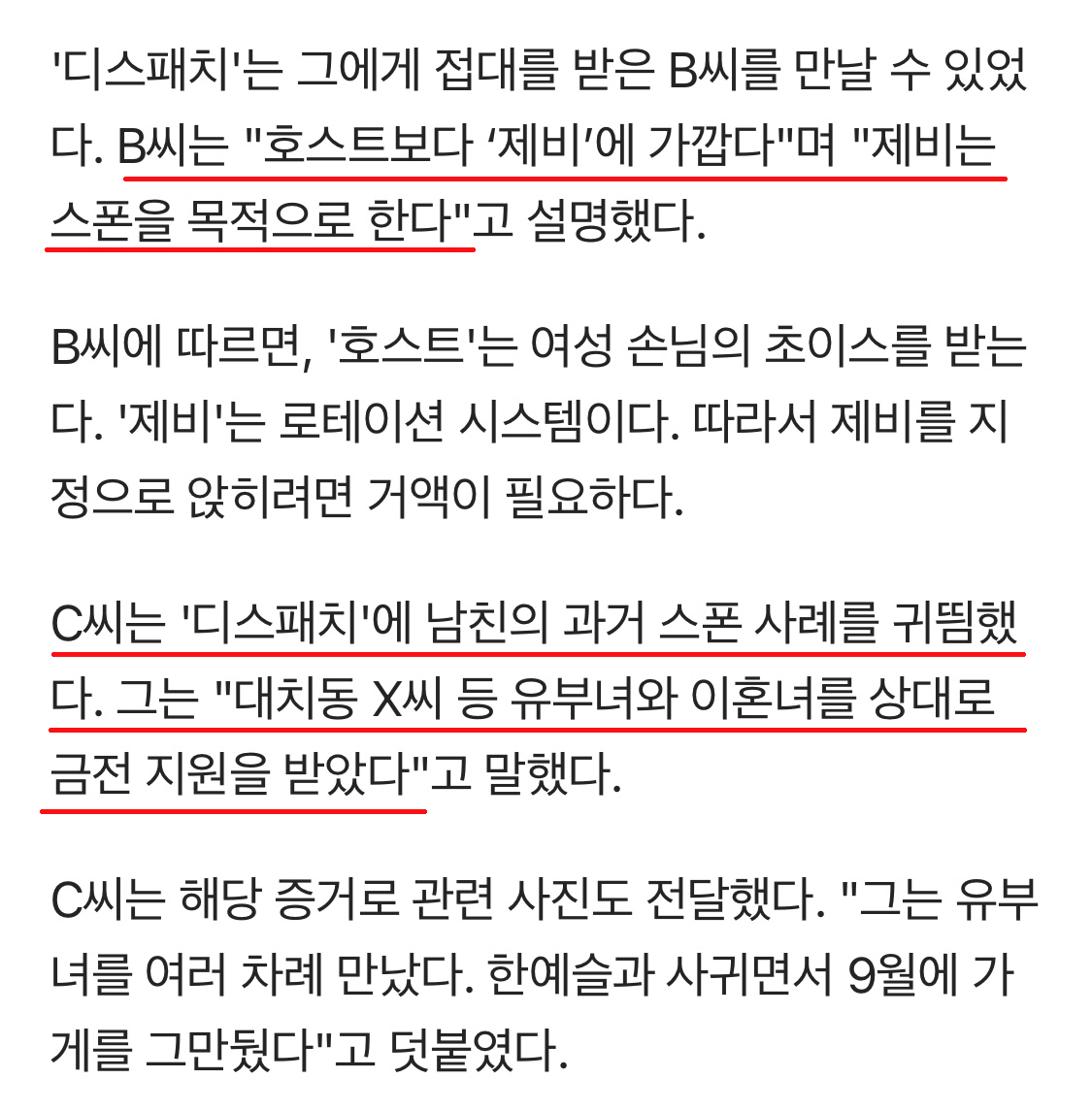 또 디스패치는 "한예슬의 남자친구가 과거 남성 접대부로 일을했다"며 대가성 관계를 맺은 점, 한예슬 남자친구 류성재에게 접대를 받았다고 주장하는 몇 제보자들의 말을 담으며 스폰을 목적으로 하는 제비였고, 유부녀와 이혼녀를 상대로 금전 지원을 받았다고 보도했습니다.