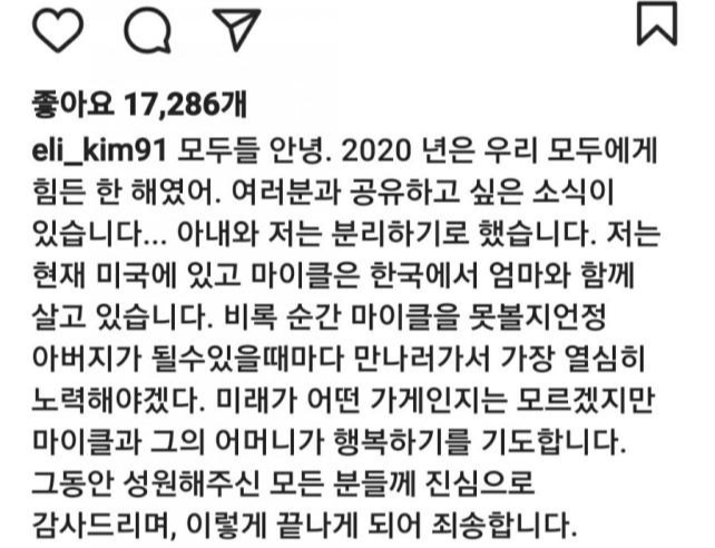 일라이는 지난 2020년 11월 자신의 SNS를 통해 직접 이혼 소식을 전했습니다. 일라이는 "2020년은 우리 모두에게 힘든 한해였다"며 "저는 현재 미국에 있고 마이클(아들)은 한국에서 엄마와 함께 살고 있다"고 전했습니다.