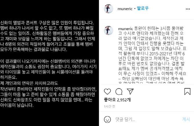 이어 "앞으론 우리끼리 비교하고 잘잘못 따지며 싸우지 말고, 이 에너지로 신화와 신화창조를 지키기 위해 싸우자"라고 전했습니다.
