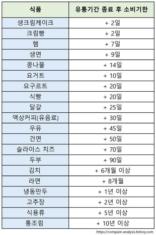 위의 표를 보면 빵(크림)종류를 제외한 냉장 식품류는 개봉을 하지 않은 경우 일주일 또는 그 이상 유통기간이 지나도 섭취할 수 있음을 알 수 있네요.