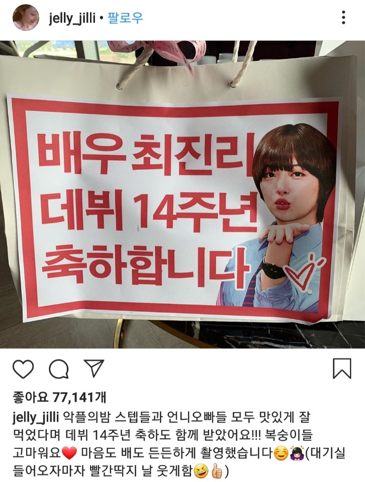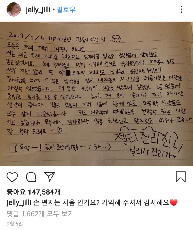 설리의 인스타그램에 따르면 손 편지는 처음이라고 주장한다.