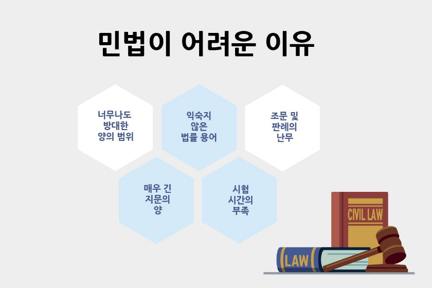 공인중개사 시험과목에서 가장 어려운 과목은 민법과 민사특별법입니다. 민법을 공인중개사의 꽃이자 지옥이라고 부릅니다. 그래서 공인중개사 시험과목을 독학하기 보다는 검증된 민법 전문 교수님이 해주시는 인강을 드는 것이 중요합니다. 2차의 꽃 부동산 공법도 마찬가지입니다.