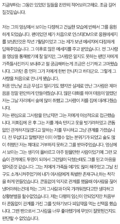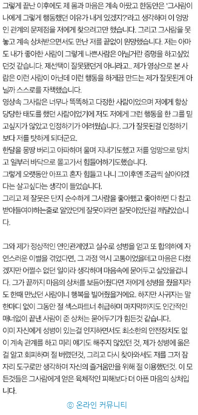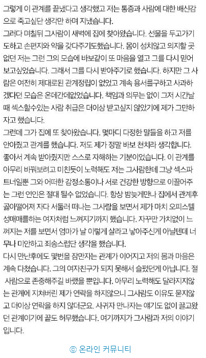 하지만 이후에도 글쓴이는 약쿠르트가 자신의 집에 찾아왔고, 관계를 맺었다고 말했다. 그는 “몇 마디 다정한 말들을 하고 저를 안아줬고 관계를 했다. 저도 제가 정말 바보 천치라 생각한다. 좋아서 계속 받아줬지만 스스로 자해하는 기분이었다. 저의 몸과 마음이 다쳤다. 아무리 노력해도 달라지지않는 관계에 지쳐버린 제가 연락을 하지 않으니 그사람도 이유도 묻지않고 더이상 연락을 하지 않았다”라고 말했다.