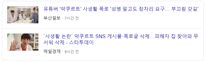현재, 약사 유튜버 약쿠르트에 대한 글은 삭제된 상태다. 작성자는 "그 사람에게 연락와서 집에 찾아오고 자살하겠다고 해서 무서워서 일단 글 내린다"고 밝히며 내용을 모두 지웠다고 밝혔다.