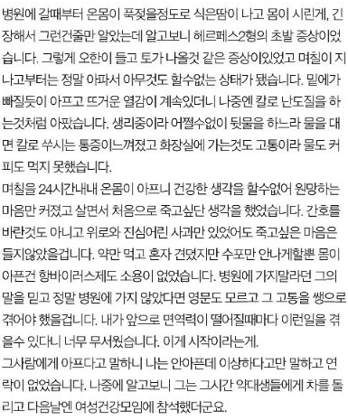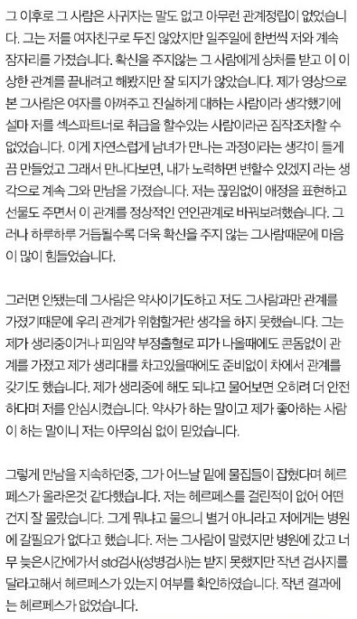 글쓴이는 “이미 자신에게 성병이 있는 걸 인지하면서도 최소한의 안전장치도 없이 계속 관계를 하고 미리 얘기도 해주지 않았던 것, 제가 성병에 옮은 걸 알고 회피하며 절 버렸던 것, 그리고 다시 찾아와서도 저를 그저 잠자리 도구로만 생각하며 자신의 즐거움만을 위해 절 이용했던 것. 이 모든 것들은 그 사람에게 얻은 육체적인 피해보다 더 아픈 마음의 상처다”라고 토로했다.