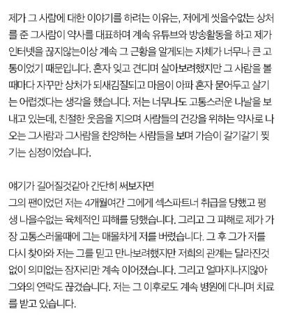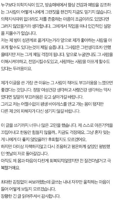 이어 “누구보다 의학지식이 있고, 방송매체에서 항상 건강과 예방을 강조하는 그 사람이 어떻게 나에게 그런 짓을 한 건지 지금도 믿기지 않는다. 의학지식 따위 없더라도 저를 존중하는 마음이 조금이라도 있었다면 그러지 않았을 거라 생각한다”라며 “그 사람이 적어도 부끄러움을 느꼈으면 좋겠다. 정말 여성 건강 생각하고 생각하는 약사였다면 일말의 부끄러움은 갖고 살아가길 바란다. 그리고 저는 어쩔 수없이 평생 바이러스를 안고 가는 몸이 됐지만 다른 제2의 피해자가 다신 생기지 않길 바란다”라고 글을 마무리했다.