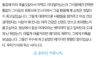 이어 “대외적으로 사람들을 챙겨주고 여성 건강을 생각한다는 사람이 왜 만나는 여자 건강은 신경 안 쓰고 회피했는지 묻고 싶더라. 그래서 그에게 우리가 무슨 사이냐고 연락했다”라며 카카오톡 메시지를 공개하기도 했다.