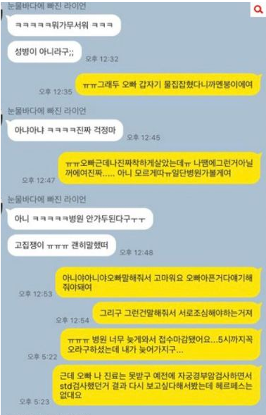 그녀는 “평생 없앨 수 없는 바이러스라 몸에 계속 지니고 살아야 한다고 했다. 면역력이 떨어지면 생식기에 수포가 올라오며 평생 약을 먹으며 관리해야 하는 병이었다”라며 “병원에서 나오자마자 그와 통화를 했다. 성병에 걸렸다는 얘기를 하자 많이 당황한 듯 보였다. 약쿠르트는 울먹이는 저에게, 왜 내가 전염시킨 것처럼 얘기를 하냐며 너가 그런 상태로는 더 이상 얘기할 수 없으니 진정하고 나중에 얘기하자고 했다. 그리고 몇 시간 후 별 거 아닌 바이러스지만 미리 얘기 안 한 것은 미안하다는 카톡이 왔다”라고 말했다고 한다.