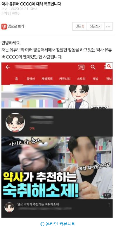24일 오후 네이트판에는 ‘약사 유튜버 OOOO에 대해 폭로합니다’라는 제목의 글이 올라왔다. 그녀는 ‘약쿠르트’ 유튜브 영상 섬네일을 모자이크 처리해 올리기도 했다.