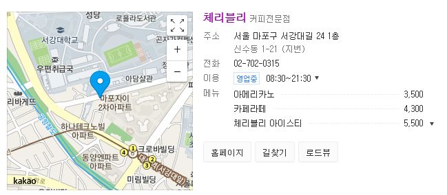카페 이름은 '체리블리'이며, 서울 마포구 서강대길 24 1층에 위치해 있습니다.