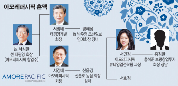 서경배 아모레퍼시픽그룹 회장의 장녀 서민정 씨가 보광창업투자 회장의 장남 홍정환 씨와 2020년 10월 결혼했습니다.