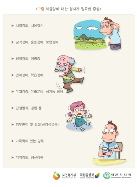 뇌종양의 가장 흔한 증상은 두통입니다. 간질 발작이 나타나거나 점진적인 운동 및 감각 능력이 소실됩니다. 오심, 구토가 나타날 수 있으며 시력이 손실되거나 복시가 나타날 수 있습니다. 또한, 뇌종양의 크기와 위치에 따라 다양한 증상이 나타날 수 있습니다. 뇌종양을 의심하게 하는 증상들은 다음과 같습니다.