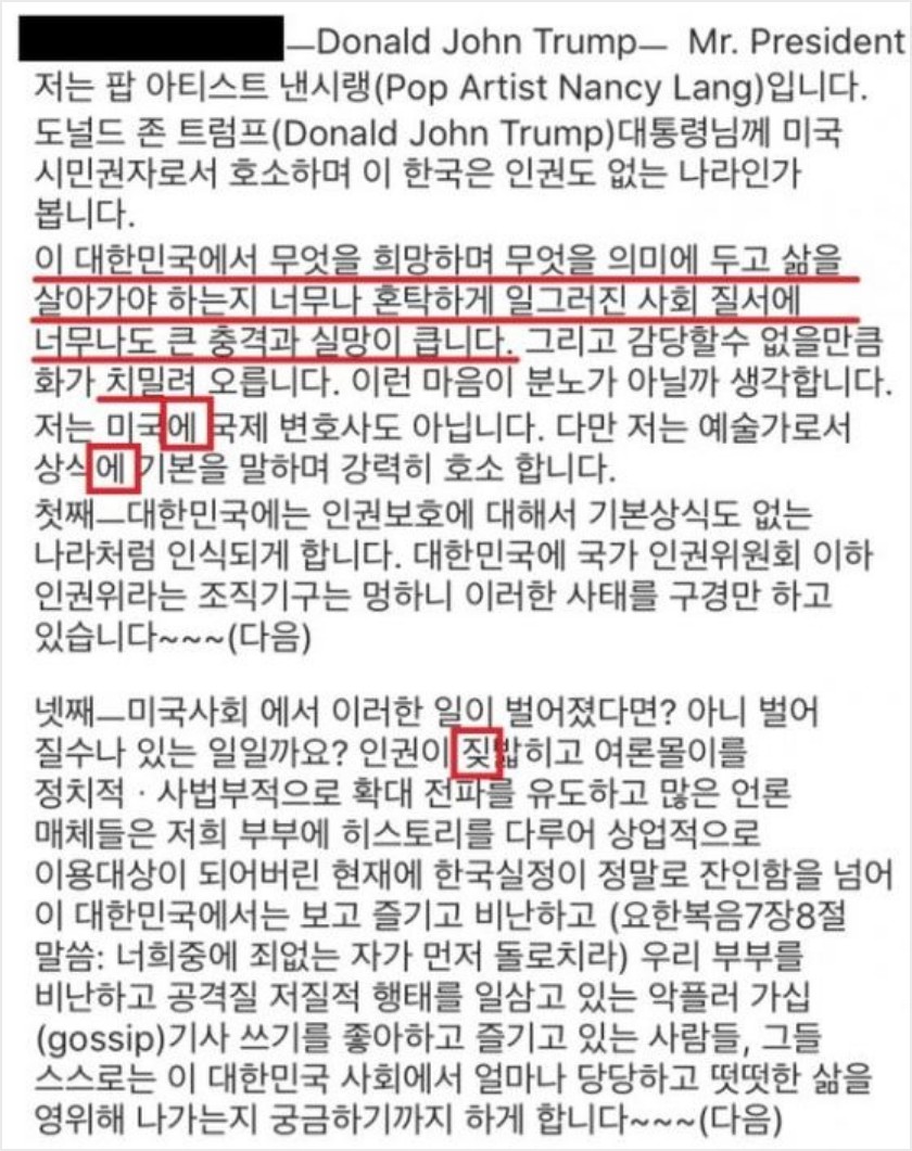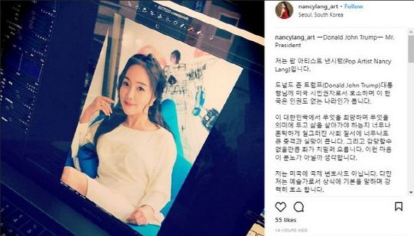논란이 계속되자 2018년 1월에 낸시랭은 자신의 인스타그램을 통해 도널드 트럼프 미국 대통령에게 "한국은 인권도 없는 나라다."라며 미국 시민권자로서 호소한다며 호소문을 남겼으나 대중들의 반응은 여전히 차가웠습니다.
