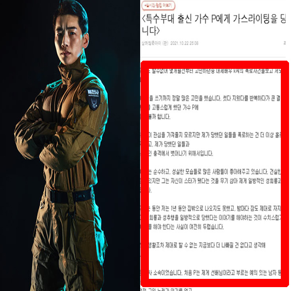 전날 온라인 커뮤니티에는 '특수부대 출신 가수 P에게 가스라이팅을 당했습니다'라는 제목의 글이 올라왔습니다.