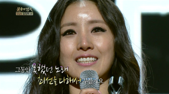 그러던 중 2013년 1월 12일 '불후의 명곡 전설을 노래하다 엄정화 '편에 출연하여 그녀의 사연이 알려졌고 가수 유미의 재출연 요청까지 쇄도하며 결국 2월 16일 김민종 편에 출연하며 얼굴 없는 가수가 아닌 가수 유미로서 입지를 다지게 됩니다.