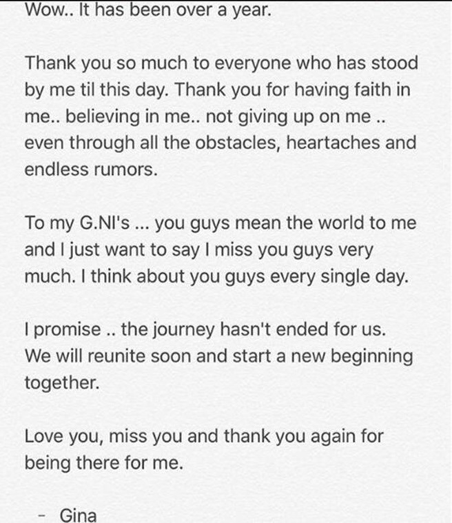 이어 지나는 "팬들은 내게 큰 세상과도 같다. 매일 팬들을 생각했다. 우리의 여행은 끝나지 않을 것이다. 우리는 다시 만날 것이고, 함께 새로운 시작을 할 것이다"라며 활동 복귀를 암시하기도 했습니다.