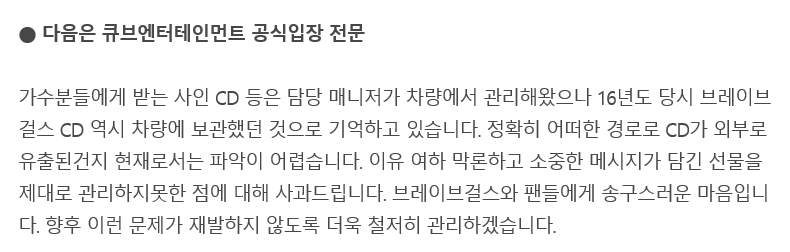 큐브엔터테인먼트는 "가수들에게 받은 사인 CD 등은 담당 매니저가 차량에 관리(보관)했으며 2016년 브레이브걸스 CD 역시 차량에 보관했던 것으로 기억한다"며 "정확히 어떤 경로로 해당 CD가 외부로 유출 된 것인지 현재 파악하기 어렵다. 다만, 이유 여하 막론하고 소중한 메시지가 담긴 선물을 제대로 관리하지 못한 점에 대해 사과한다"고 사과했습니다.