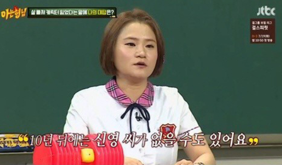 김신영은 학창 시절 날씬한 몸이었지만 코미디언으로 활동하면서 체중이 불어났으며 당시 '행님아'로 한창 활동 중이라 캐릭터 이미지 때문에 체중을 유지해야만 했다고 하는데요.