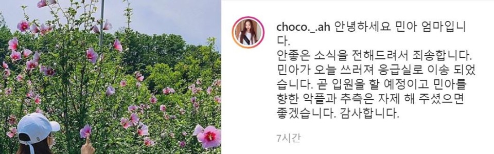 또한 성산대교 난간에 올라가 극단적 선택을 하려던 도중 구조됐다는 기사 캡처 사진과 함께 "제발 악플 그만 다세요 힘들어요"라는 게시글을 추가로 게재하며 악플러들에게 간곡히 당부했습니다.