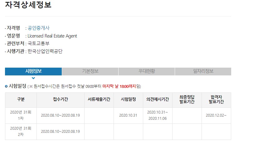 공인중개사 시험은 1년에 1회 보기 때문에 공인중개사 시험과목에 따라 공부 계획을 잘 세울 필요가 있습니다. 2020년은 8월 10일부터 접수를 시작해 10월 31일에 시험을 봅니다. 이때 1, 2차 시험을 함께 봅니다. 10월 31일부터 11월 6일까지 의견제시기간을 갖고 합격자 발표는 12월 2일부터입니다.