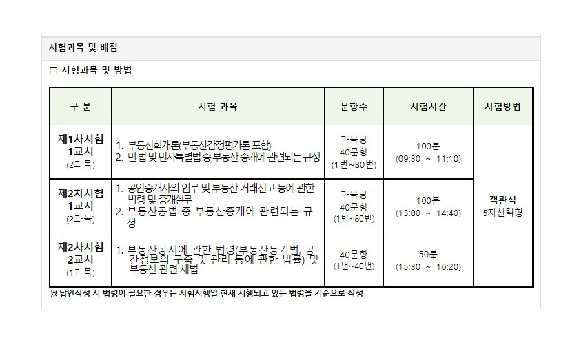 공인중개사 시험과목은 총 5과목입니다. 1차 시험에서 부동산학개론과 민법 및 민사특별법 중 부동산 중개에 관련되는 규정을 시험 보는데, 과목당 40문항을 객관식 5지 선택형으로 보게 됩니다. 2차 공인중개사 시험과목은 공인중개사의 업무 및 부동산 거래신고 등에 관한 법령 및 중개실무, 그리고 부동산 공법 중 부동산 중개에 관련되는 규정을 역시 40문항씩 테스트합니다.