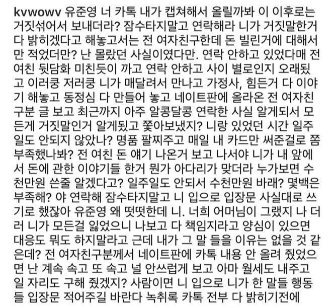 권민아는 29일 인스타그램에 전 남자친구 유준영과 나눈 카톡 메시지 내용을 공개하며 긴 글을 올렸습니다.