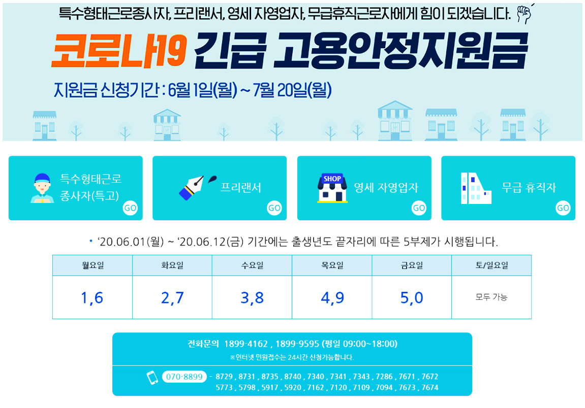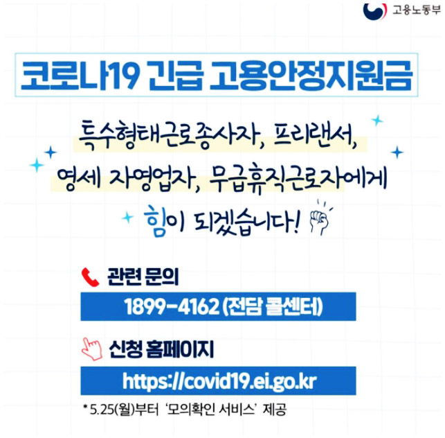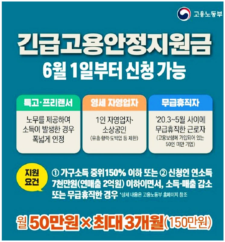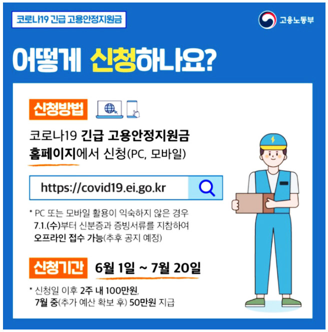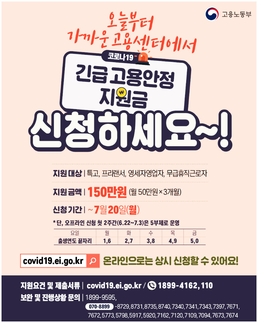 또한 7월부터는 인터넷 뿐만 아니라 고용센터에서도 신청이 가능하다고 하니, 인터넷 사용이 어려우신 분들은 7월에 가까운 고용센터를 방문하시어 신청하시길 바라겠습니다. 코로나19사태가 생각보다 오랜 시간동안 지속되면서 정말 많은 분들이 힘드실거라 생각합니다. 하지만 우리가 함께 이겨나가야 빠른 회복이 가능합니다. 그러니 우리 모두 힘내어 이 힘든 시기를 헤쳐나가봐요! 대한민국 파이팅!