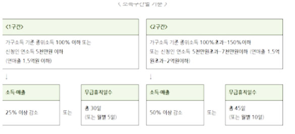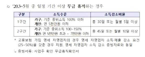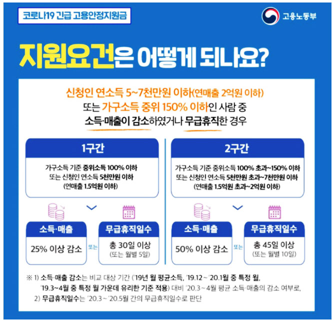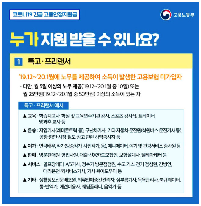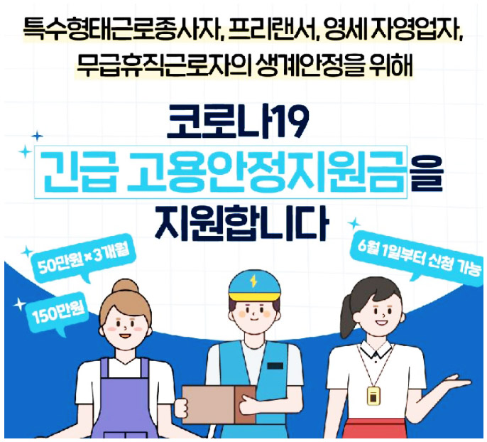 특수형태근로종사자나 프리랜서의 경우 19년 12월~20년 1월에 노무를 제공하여 소득을 벌어들인 고용보험 미가입자가 해당되고, 영세 자영업자 역시 19년 12월~20년 1월 자영업을 통해 소득이 있는 1인 자영업자 혹은 소상공인 중 고용보험 미가입자에 해당됩니다. 그에 반해 무급휴직자는 20년 3월~5월에 50인 미만 기업에 근로하며 무급휴직으로 근로한 고용보험 가입자가 해당됩니다.