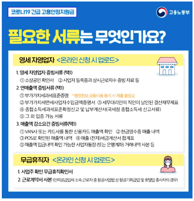 그리고 자신이 특수형태 근로종사자인지, 영세 자영업자인지, 무급휴직자인지에 따라 자신의 소득을 증빙하는 서류가 각각 다르게 있습니다. 자세한 서류 사항은 긴급고용안정지원금 홈페이지(https://covid19.ei.go.kr/eisp/eih/es/cv/main.do)에 들어가셔서 본인에게 해당하는 형태를 누르시면 자세히 알아보실 수 있습니다. 자신에게 해당하는 증빙 서류들 중 한가지를 택하여 공통서류와 함께 준비하시면 됩니다.