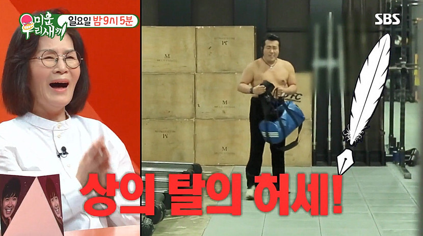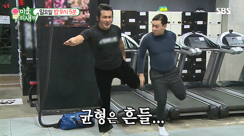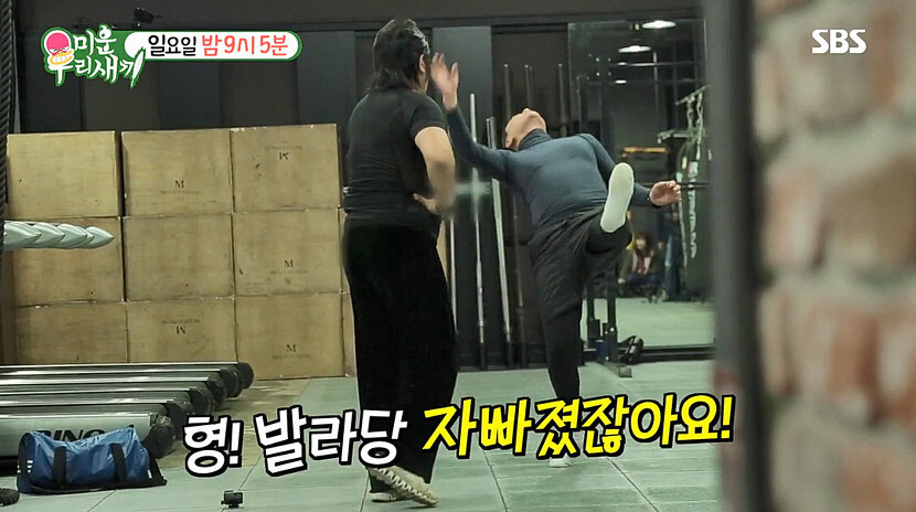 하지만, 본격적인 운동이 시작되자 김보성은 정작 운동보다 외모 점검에 관심이 많은가 하면, 깜짝 몸 개그로 허당美 가득한 반전 모습을 보여줍니다. ‘기왓장 18장 깨기’ 기록을 갖고 있다며 격파 허세 를 잔뜩 부린 보성은 상민에게 송판 깨기를 제안하기도..