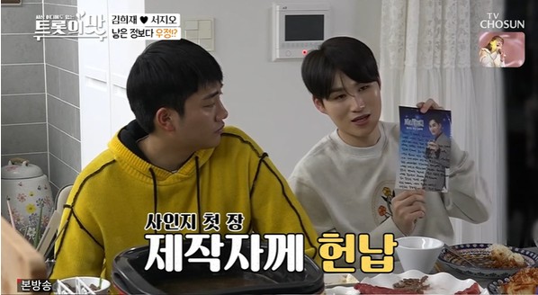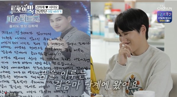 김희재는 서지오 덕에 트로트 가수로 자리매김 했다는 손편지를 써서 선물했습니다. "사인지도 이모가 만들어 준 거다. 그래서 첫 장을 이모한테 쓴 거다. 같이 꽃길만 걸어요 이모. 제게 1등인 거 아시죠? 사랑하고 존경합니다. 조카 희재."라고 쓴 걸 듣자 서지오는 "김희재의 이모라는 말을 듣는 게 너무 감사하다."고 감격했습니다.