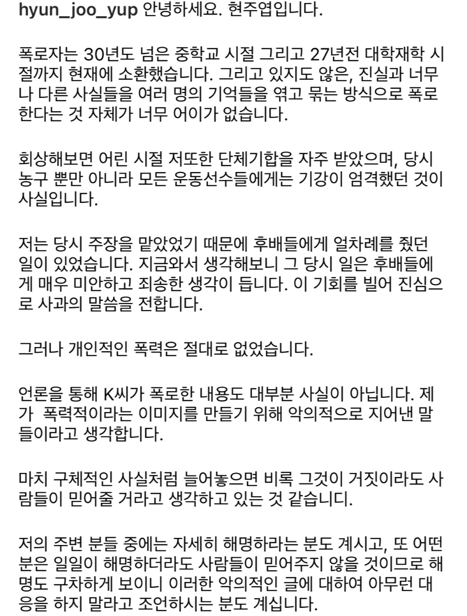 지난 14일 현주엽은 자신의 인스타그램에 "폭로자는 30년도 넘은 중학교 시절 그리고 27년 전 대학 재학 시절까지 현재에 소환했다"며 "진실과 너무나 다른 사실들을 여러명의 기억들을 엮고 묶는 방식으로 폭로한다는 것 자체가 너무 어이가 없다"고 학폭 의혹에 전면 반박했습니다.