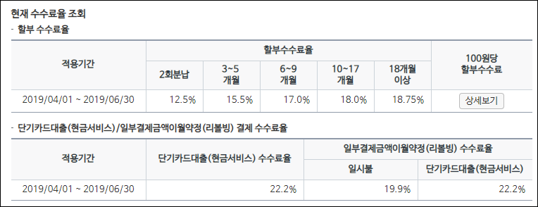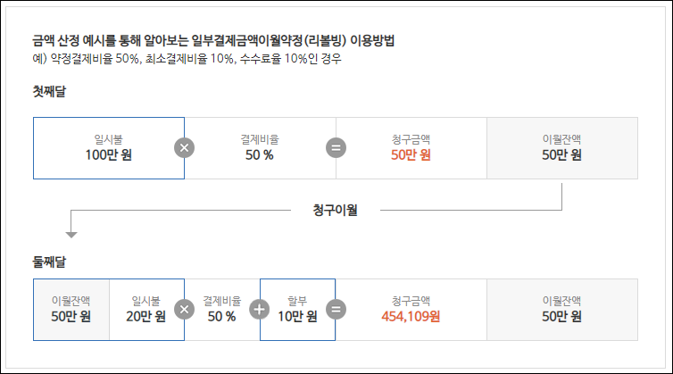 만약, 약정결제비율을 50%로 잡았을 경우 100만원 결제 시 50만원은 청구되고 남은 잔액은 둘째달로 이월됩니다. 그러나 여기서 주의할 점은 이 서비스도 수수료가 존재한다는 점입니다.
