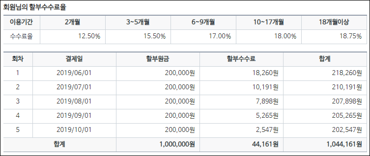 만약, 100만원짜리 제품을 5개월 할부로 구입했을 때 총 할부수수료는 44,161원입니다. 만만치 않은 금액이기 때문에 될 수 있으면 무이자할부가 되는 상품을 구입하는게 좋겠죠?