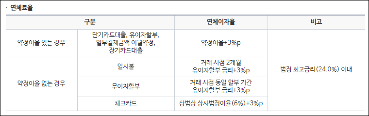 제품을 구입했다가 할부금을 상환하지 못해 연체되는 경우도 간혹 발생합니다. 이 때, 유이자할부 금리+3%, 법정 최고금리 24% 이내로 적용됩니다. 게다가, 연체되면 신용도 하락에도 영향을 미치기 때문에 주의해야하는데 그래서 마련된 제도가 일부결제금액이월약정(리볼빙)제도입니다.