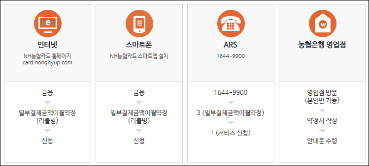 리볼빙 신청 및 해지는 인터넷, 스마트앱, ARS, 영업점 등을 통해 진행할 수 있습니다. 앞서 이야기했듯이 수수료가 존재하기 때문에 꼭 필요하신 분들만 가입 후 사용하시기 바랍니다.