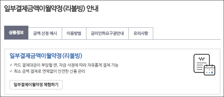 리볼빙은 카드대금이 부담될 때 최소 금액을 결제하고 나머지 금액은 다음 달로 이월할 수 있는 제도로 신용도 하락 예방하는 서비스입니다. (10~100% 범위 내 10% 단위로 결제비율을 설정)