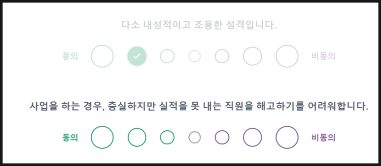 사실 저도 저만의 생각이 확고한 편인데요. 그러다보니 마음에 들지 않는 질문이나 스스로 생각하기에 답이 없는 경우도 있습니다. 그렇다고 답변을 하지 않을 수 없고 답변을 하지 않는다면 검사가 불가능 할 것입니다. 다양한 질문을 함으로써 스스로를 객관적으로 검사하고자 하는 의도가 있지 않을까 추측합니다.
