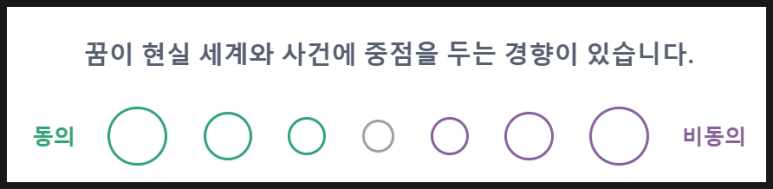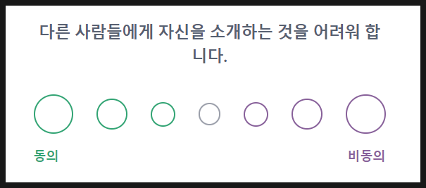 아래는 첫 번째 질문인데요 답변을 보면 동의부터 비동의까지 7개의 선택지가 있습니다. 정 가운데를 선택하면 중립이 되겠네요. 나 자신을 알기 위해서는 스스로 나서야 합니다. 되도록이면 정 가운데가 아닌 다른 것을 선택함으로써 스스로를 알린다고 생각해보면 좋을 것 같습니다.