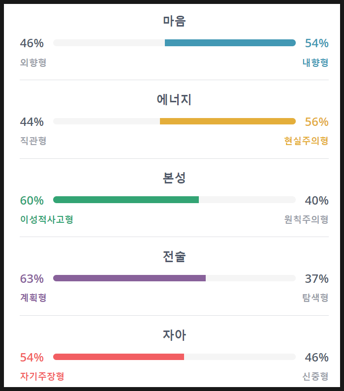 옆에 백분율로 마음, 에너지, 본성, 전술, 자아로 나뉘어져 제 성격이 어느 쪽에 더 쏠려 있는지 알려주고 있습니다. 몇 가지 수치를 보면 언제든 뒤바뀔 수 있는 정도의 차이로 보여지네요. 사람의 성격이란게 정답이 없는 것처럼 MBTI의 결과도 언제든 바뀔 수 있지 않을까 생각합니다.
