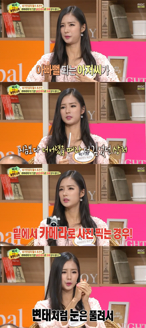 박기량: "제 쌍꺼풀이 굵지가 않아요. 눈 큰 연예인들을 보면 많이 부러웠죠. 쌍거풀 수술도 하고 싶었는데, 요즘은 눈 큰 사람이 너무 많잖아요. 지금 제 눈이 더 매력적이라고 생각해요."