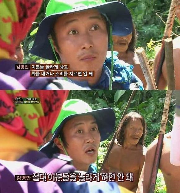 족장인 김병만이 원시부족 와오라니족을 만나면서 "절대 이 분들을 놀라게 해서는 안돼!"라고 소리칩니다.