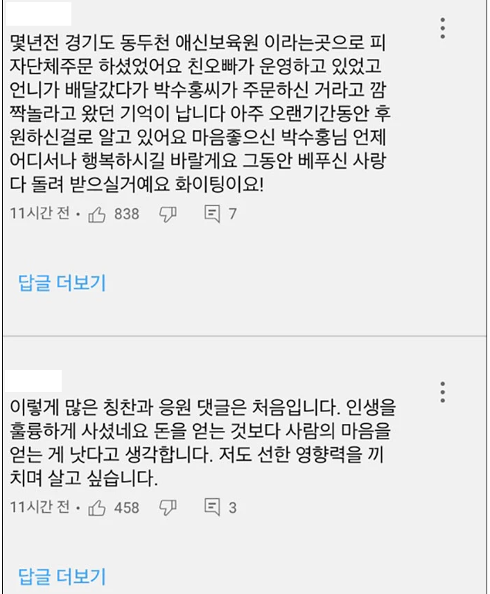 가족이 운영하고 있는 피자집이 보육원에 배달을 갔었는데 알고보니 주문자가 박수홍님이였다는 미담입니다. 정말로 착한일을 많이하시는 분 같습니다.