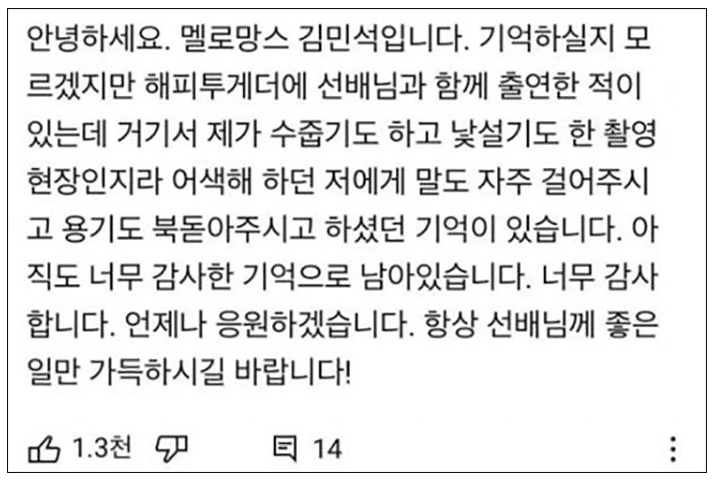 박수홍이 10년 전 KBS에서 <여유만만>이라는 프로그램을 진행할 때, 당시 막내 자가였던분의 사연입니다. 당시 사연자는 막내라서 일도 서툴르고 많이 대화도 하지 못했지만, 박수홍님의 '힘내자'라는 말과 웃음, 인간적으로 대해주던 태도에서 많은 감동을 받았다고 합니다.