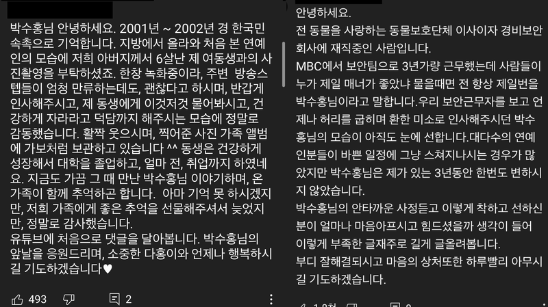 오늘 박수홍님의 미담을 살펴보았는데요. 악의적으로 박수홍님을 깎아내리려는 사람들을 보면 울화가 치밀어오릅니다. 다행이도 이렇게 인터넷을 통해 일반시민분들이 여러 미담을 올려주셔서 좋네요.ㅠㅠ 박수홍님의 안타까운 일이 하루빨리 정상적으로 돌아왔으면 좋겠습니다. 읽어주셔서 감사합니다.