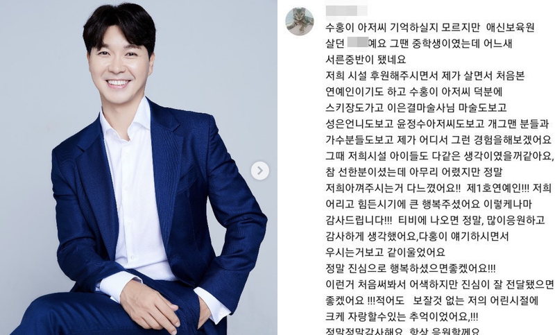 다음 사연자분은 박수홍님에게 후원 받던 애신보육원의 한 분입니다. 사연자분은 중학생이였던 당시 박수홍님 덕분에 스키장도 가고 이은결마술사도 보고, 성은언니, 윤정수, 더불어 여러 개그맨, 연예인, 가수분들을 보았던 추억을 이야기해주셨는데요. 덕분에 행복했다고 사연을 적어주셨습니다. 정말 까도까도 미담밖에 나오지 않는 박수홍님입니다.
