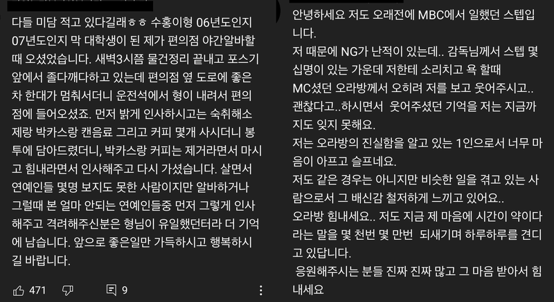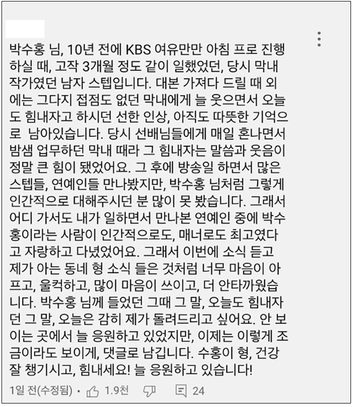 박수홍이 10년 전 KBS에서 <여유만만>이라는 프로그램을 진행할 때, 당시 막내 자가였던분의 사연입니다. 당시 사연자는 막내라서 일도 서툴르고 많이 대화도 하지 못했지만, 박수홍님의 '힘내자'라는 말과 웃음, 인간적으로 대해주던 태도에서 많은 감동을 받았다고 합니다.